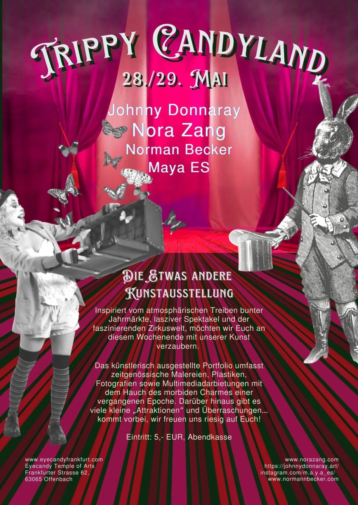 With the magical Nora Zang, other artists and me, in addition to an artistic exhibition, you will experience a journey into the diverse world of a sweet, strange and unique fair. More than 20 experiences will make your hearts shine.